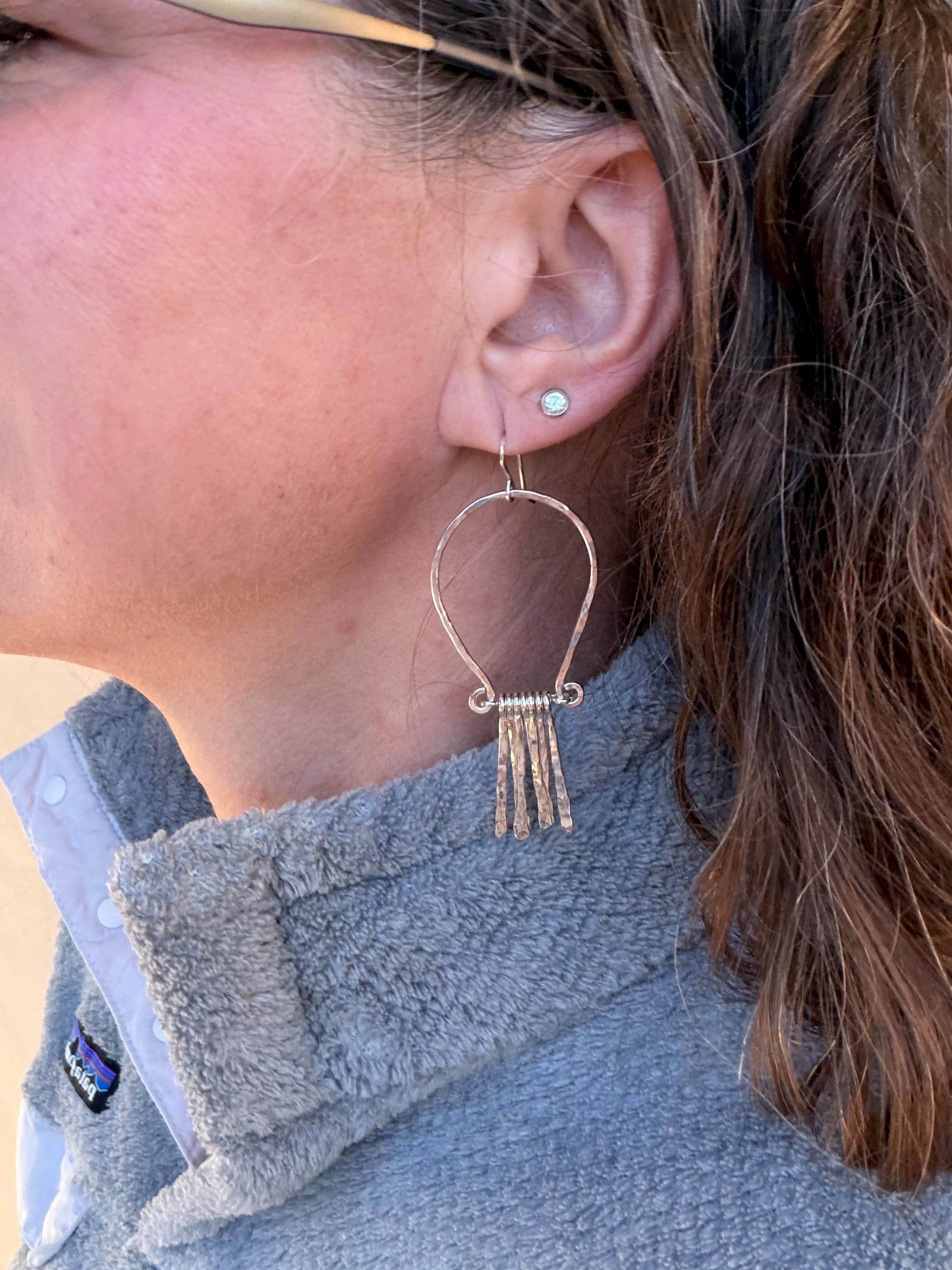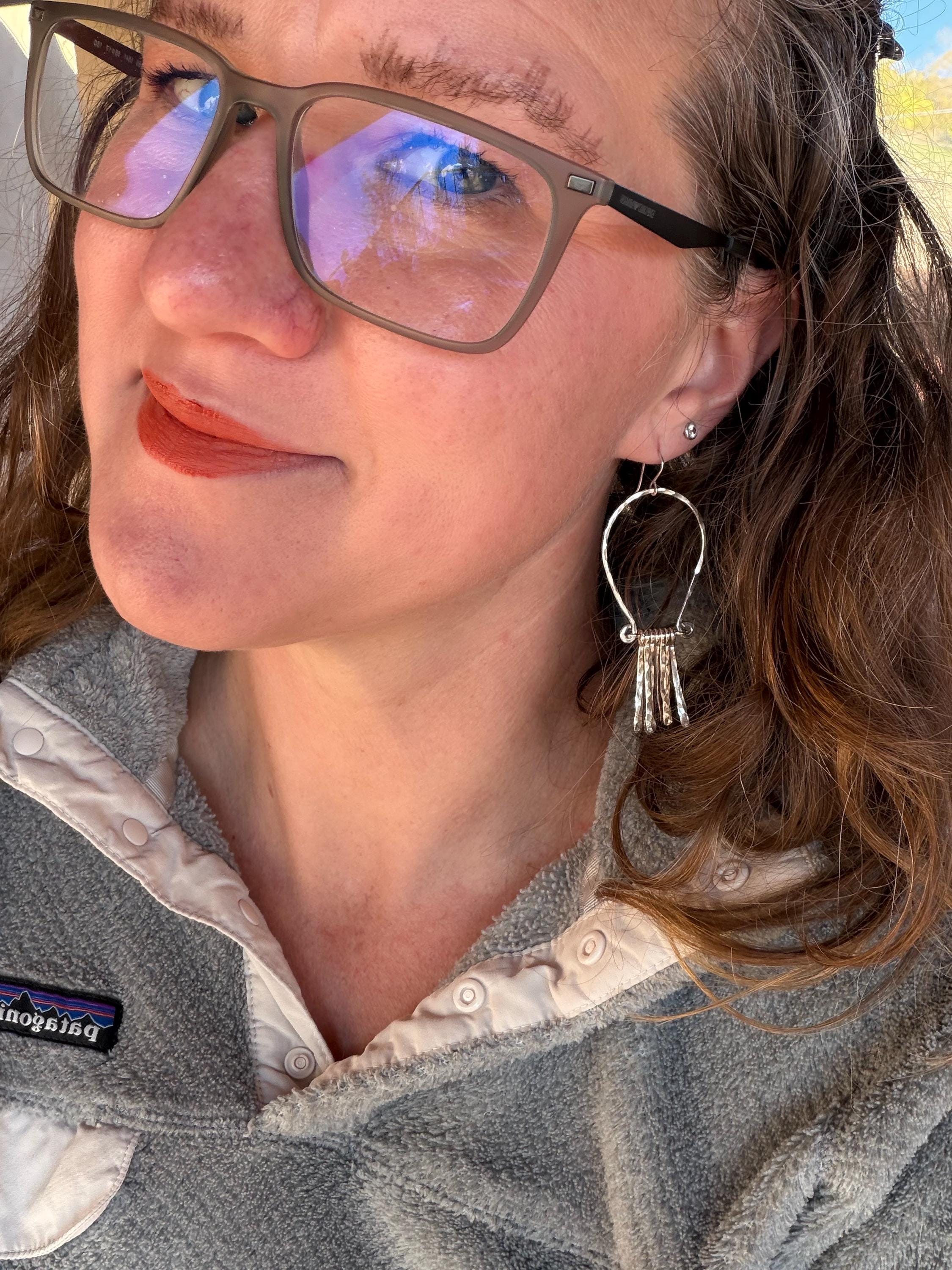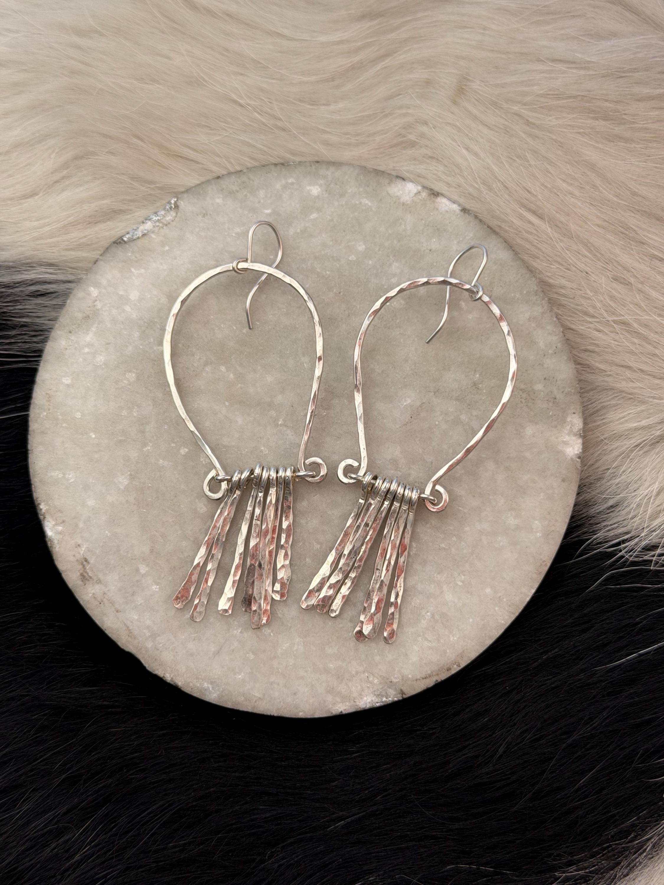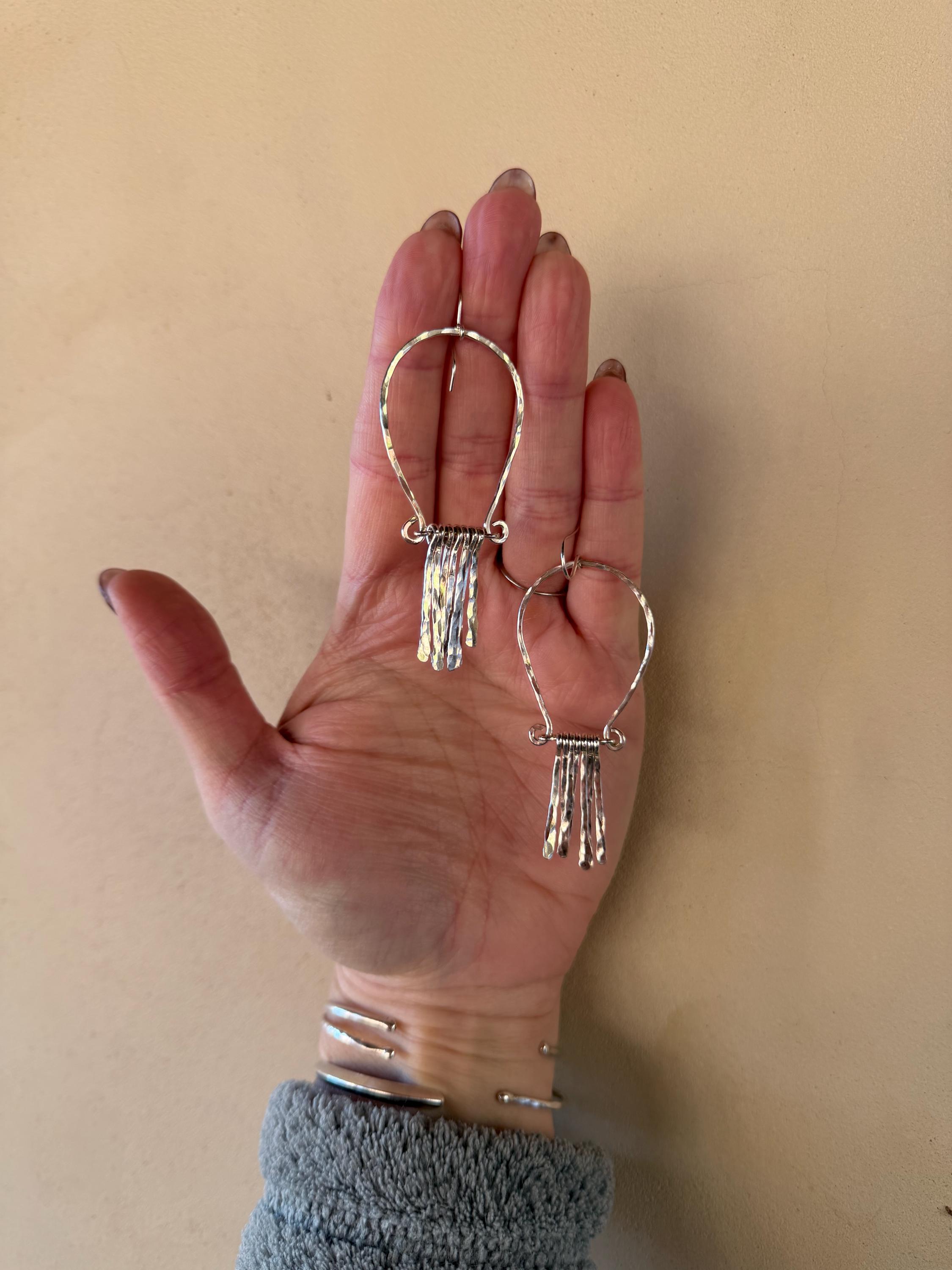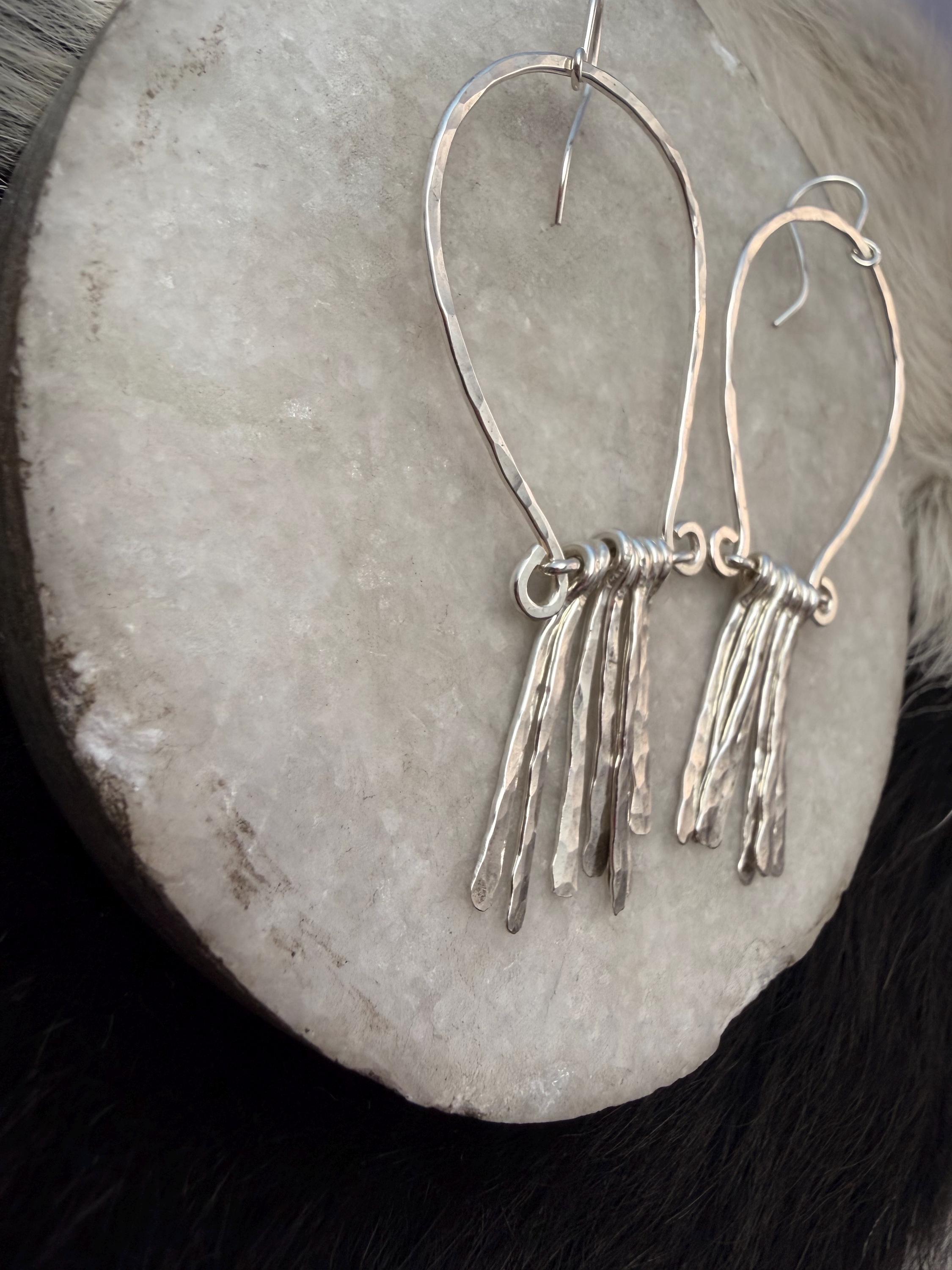 This is the Vivian earring. Its a rounded arc shape with hand forged metal fringe in sterling silver.