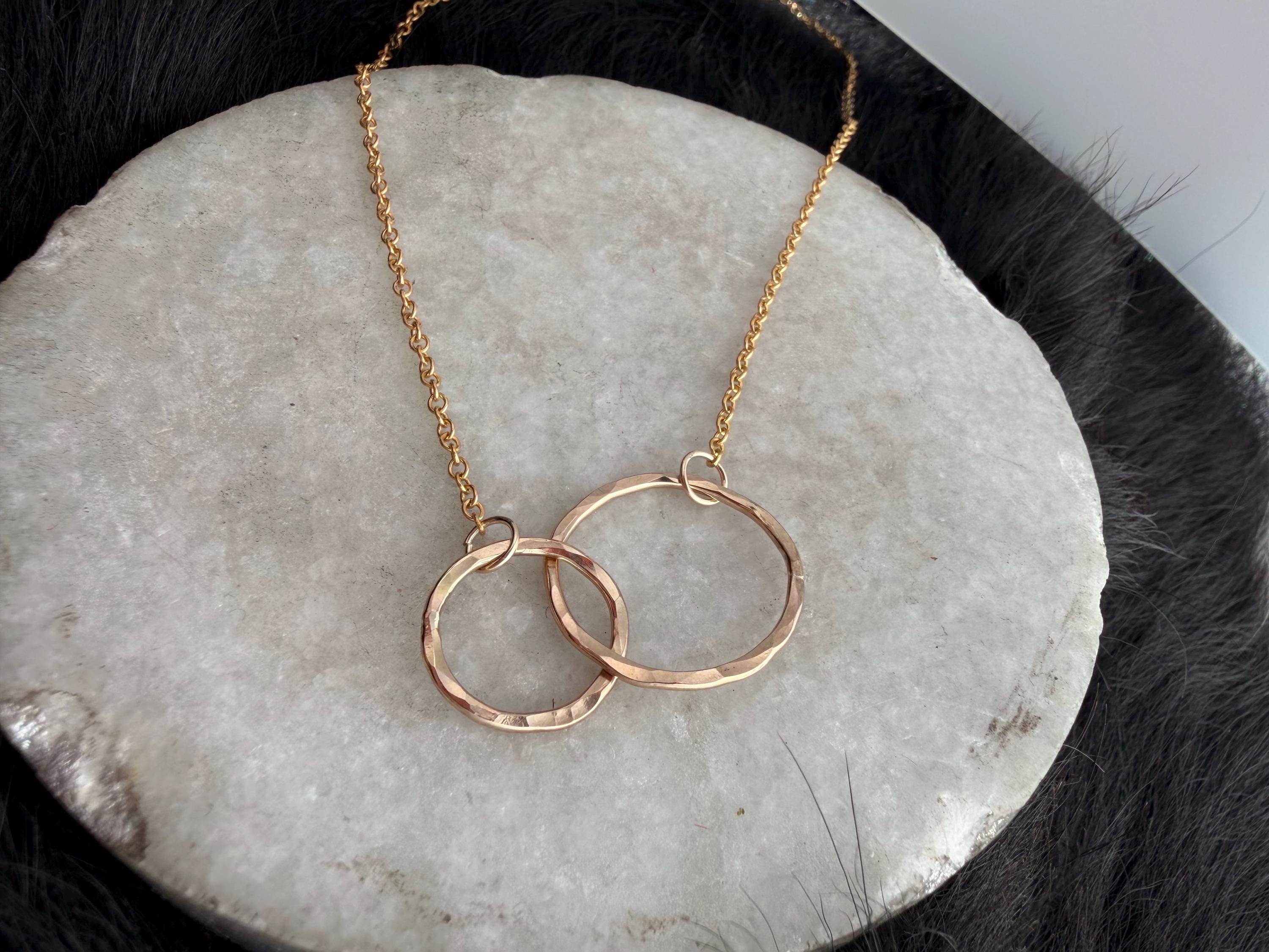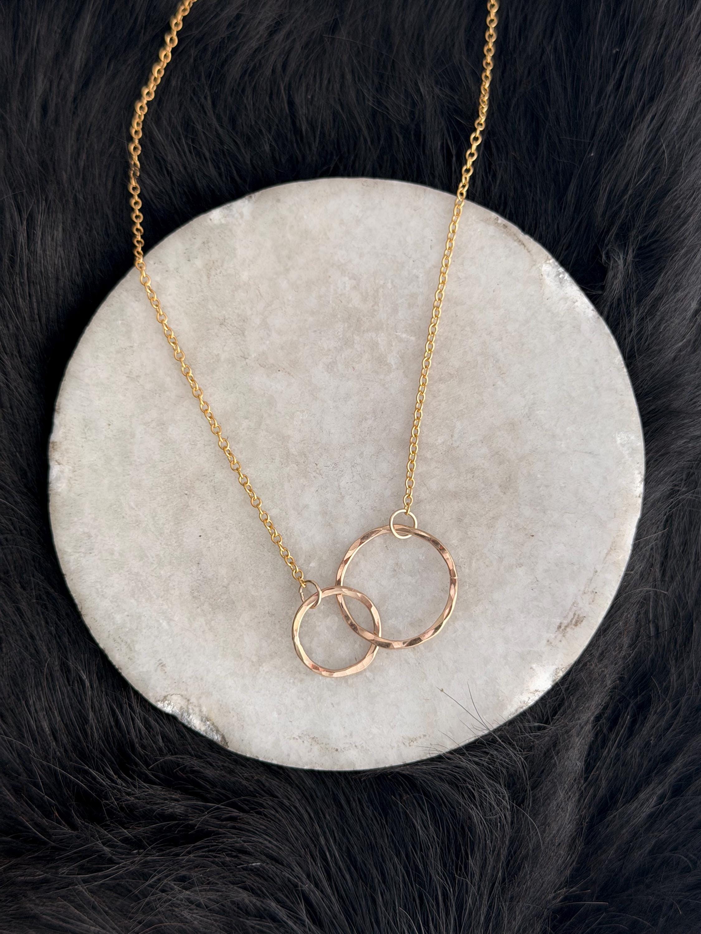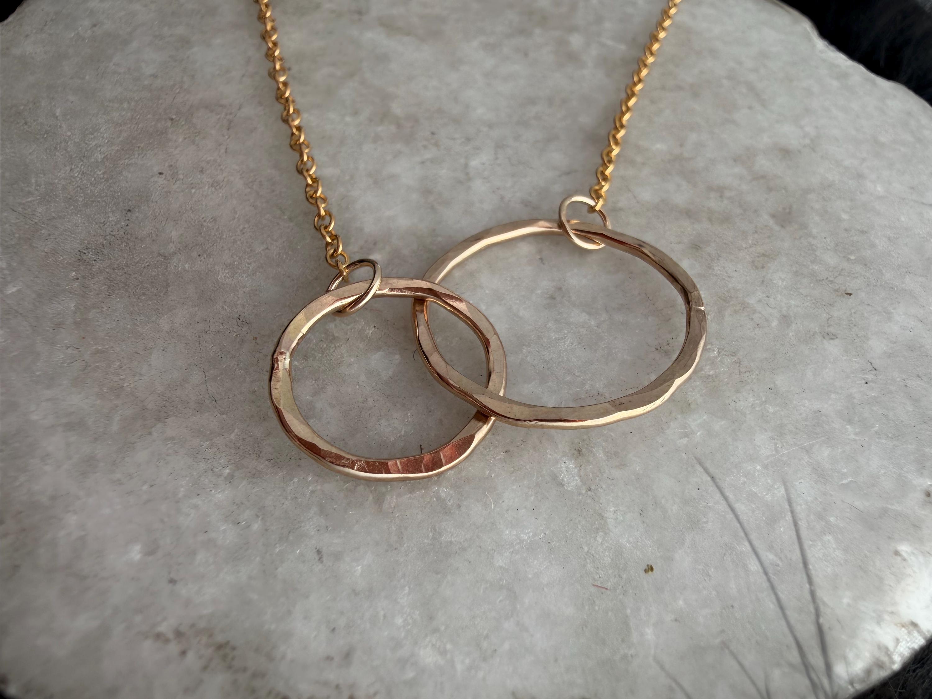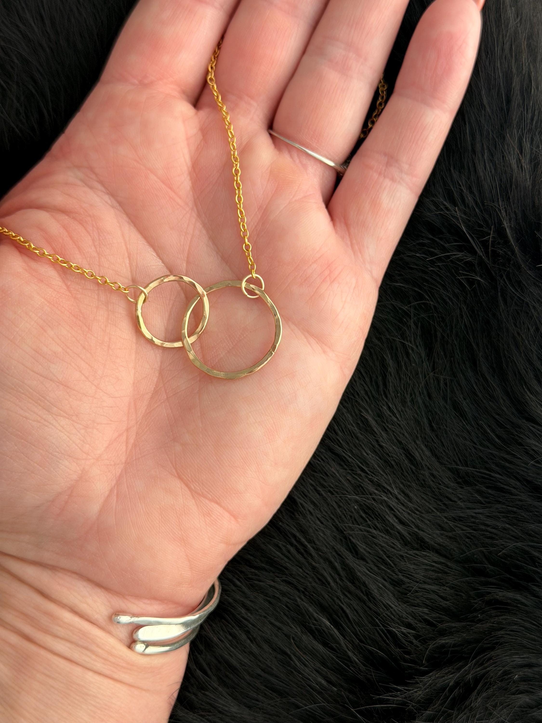 I call this design "Lydia" because I love jewelry like they are my friends. This necklace is two interlocking circles, one smaller and one larger one, both of 14k gold-fill with gold fill chain attached to each circle and totaling 17 and 1/2 inch chain length. These circles are interlocking and provide a stunning movement quality. They are made by hand and finished off with a 14k Gold fill clasp as well.