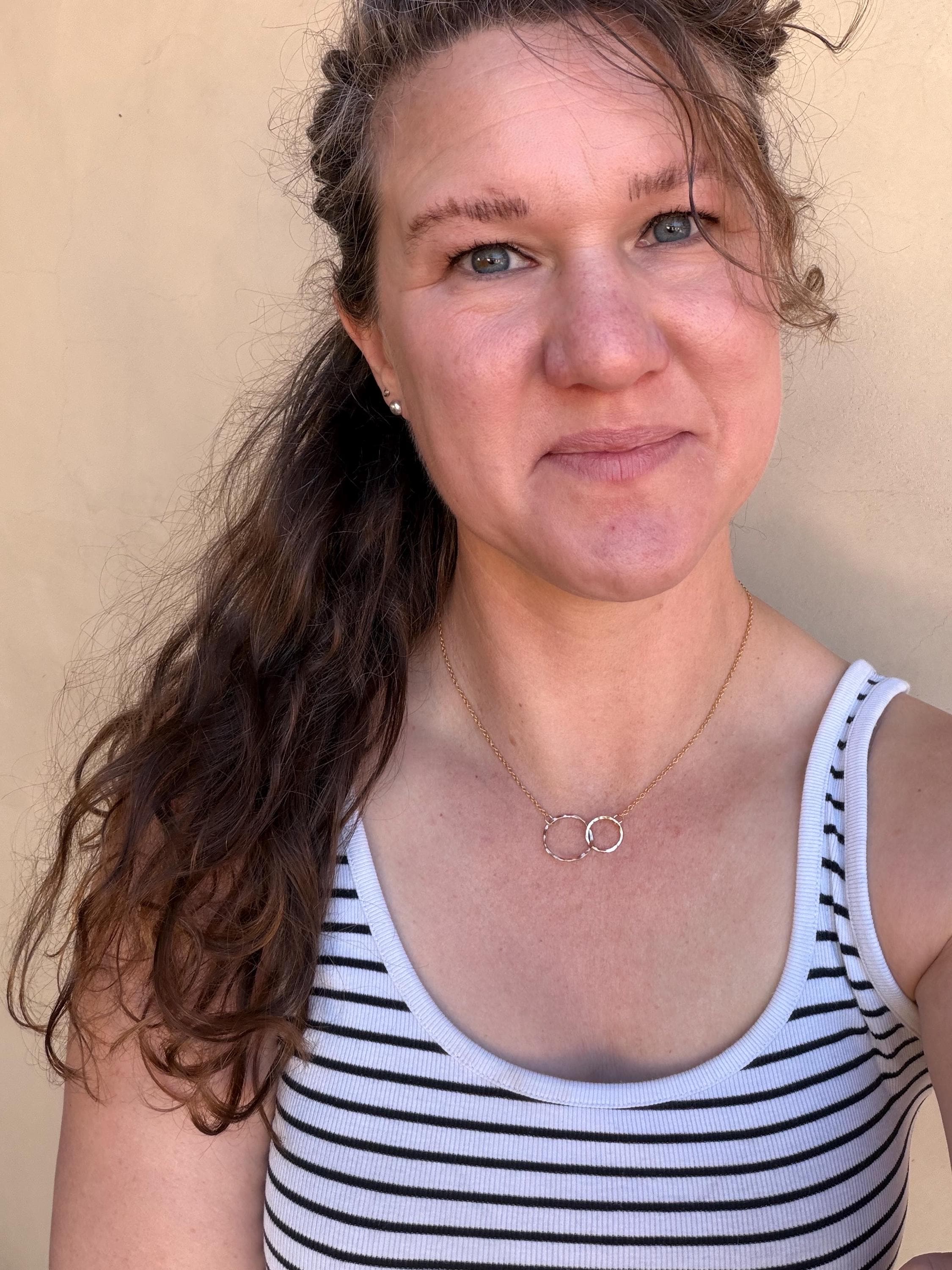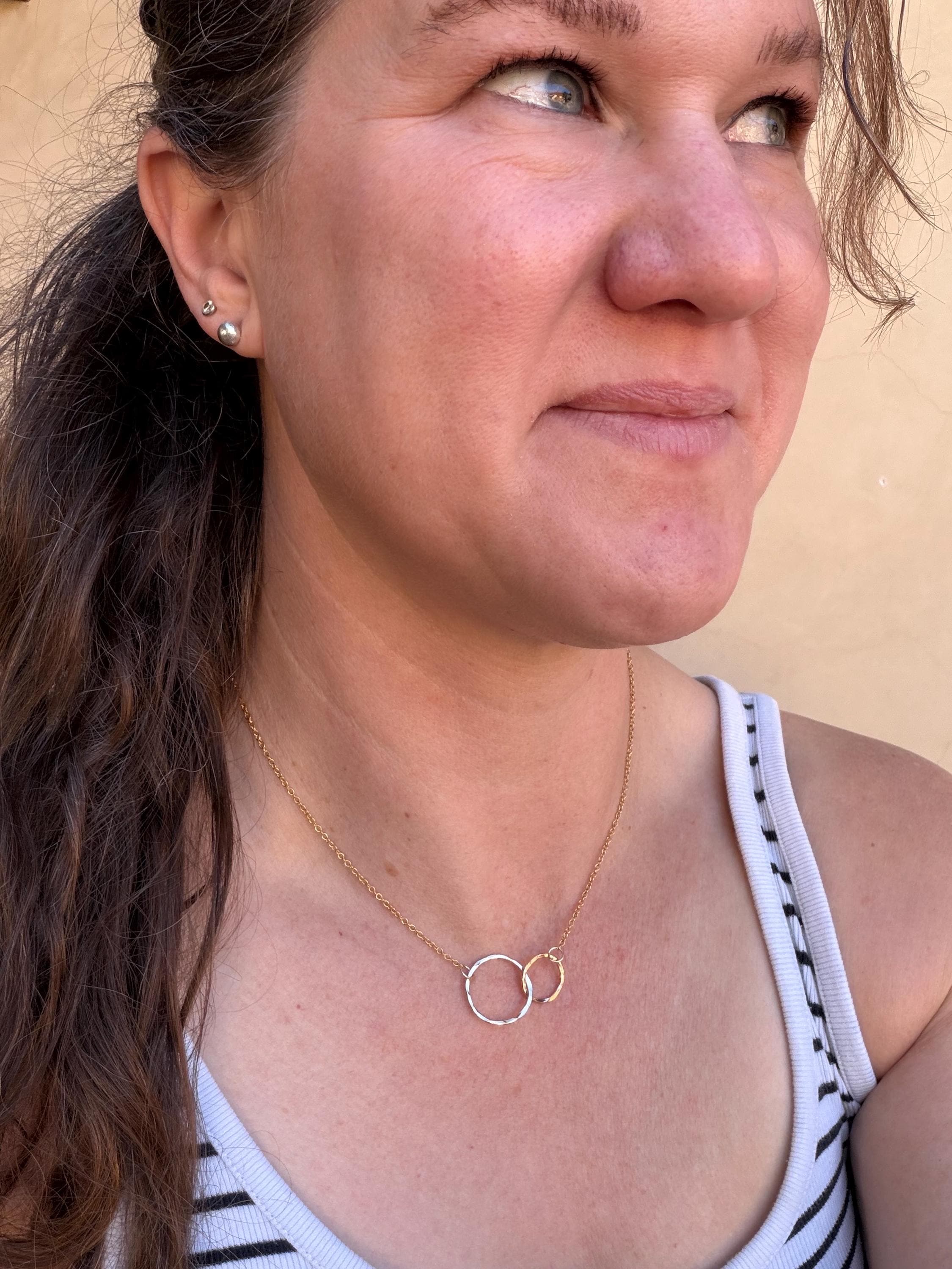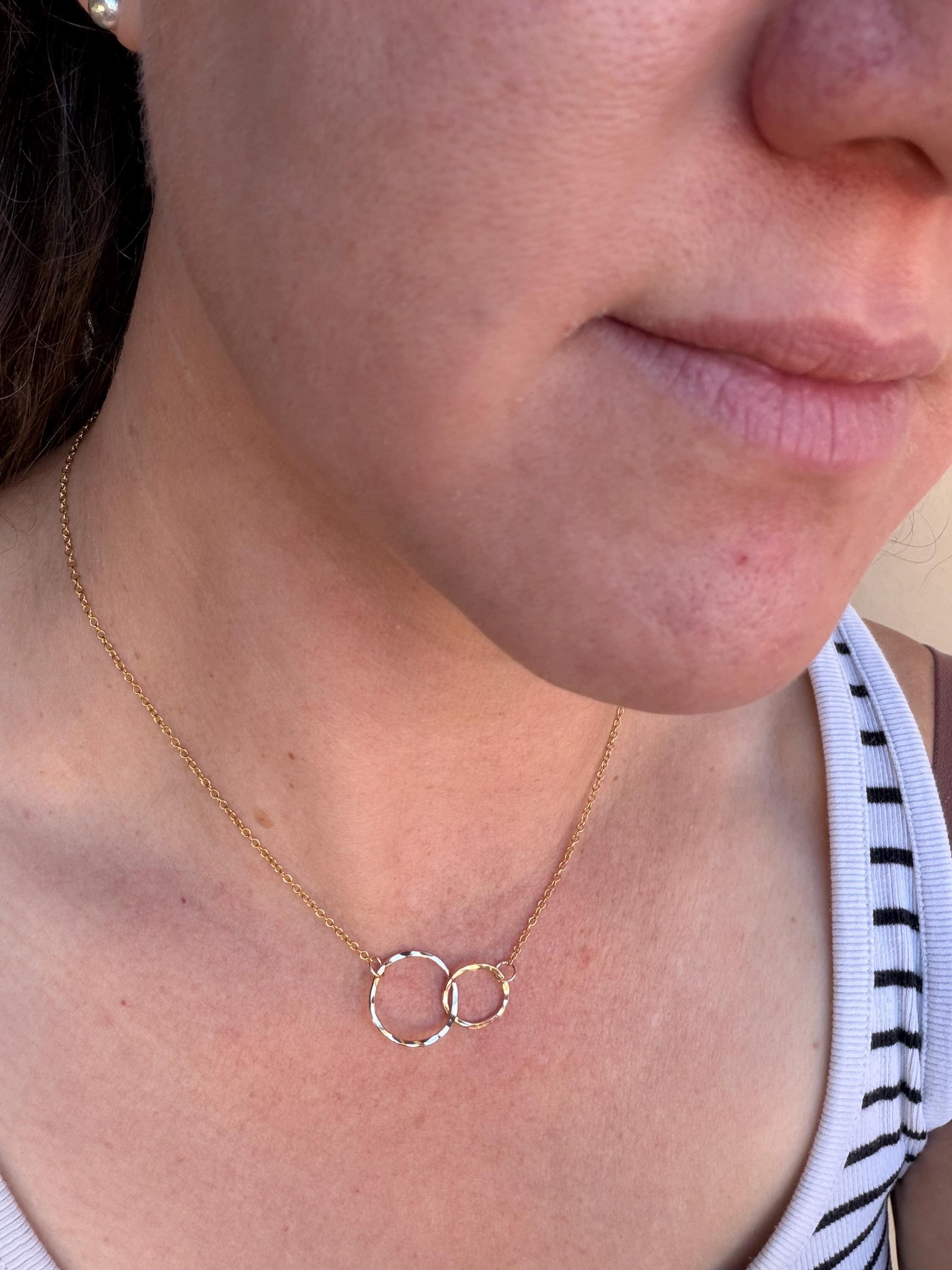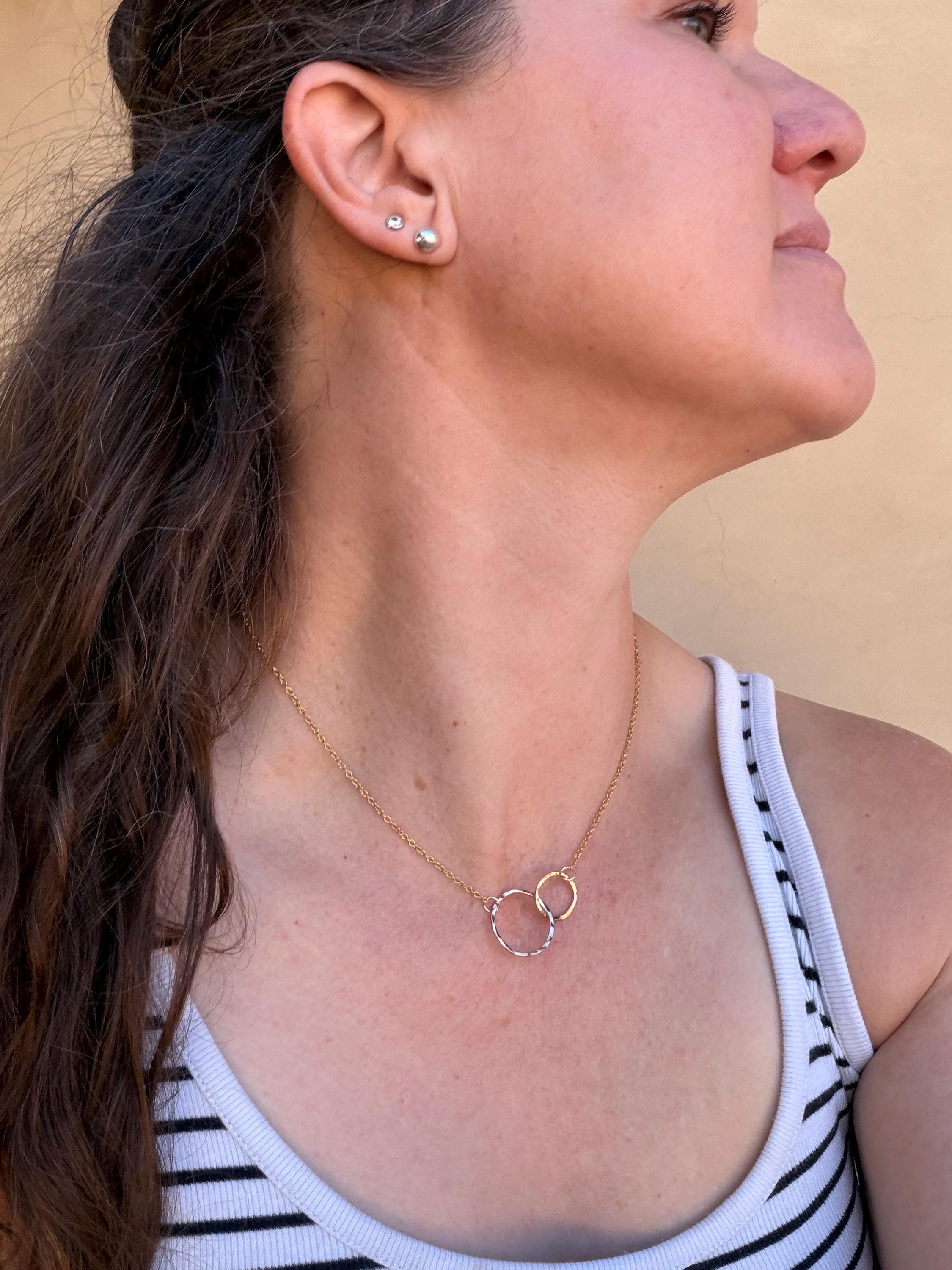 I call this design "Lydia" because I love jewelry like they are my friends. This necklace is two interlocking circles, one smaller and one larger one, both of 14k gold-fill with gold fill chain attached to each circle and totaling 17 and 1/2 inch chain length. These circles are interlocking and provide a stunning movement quality. They are made by hand and finished off with a 14k Gold fill clasp as well.