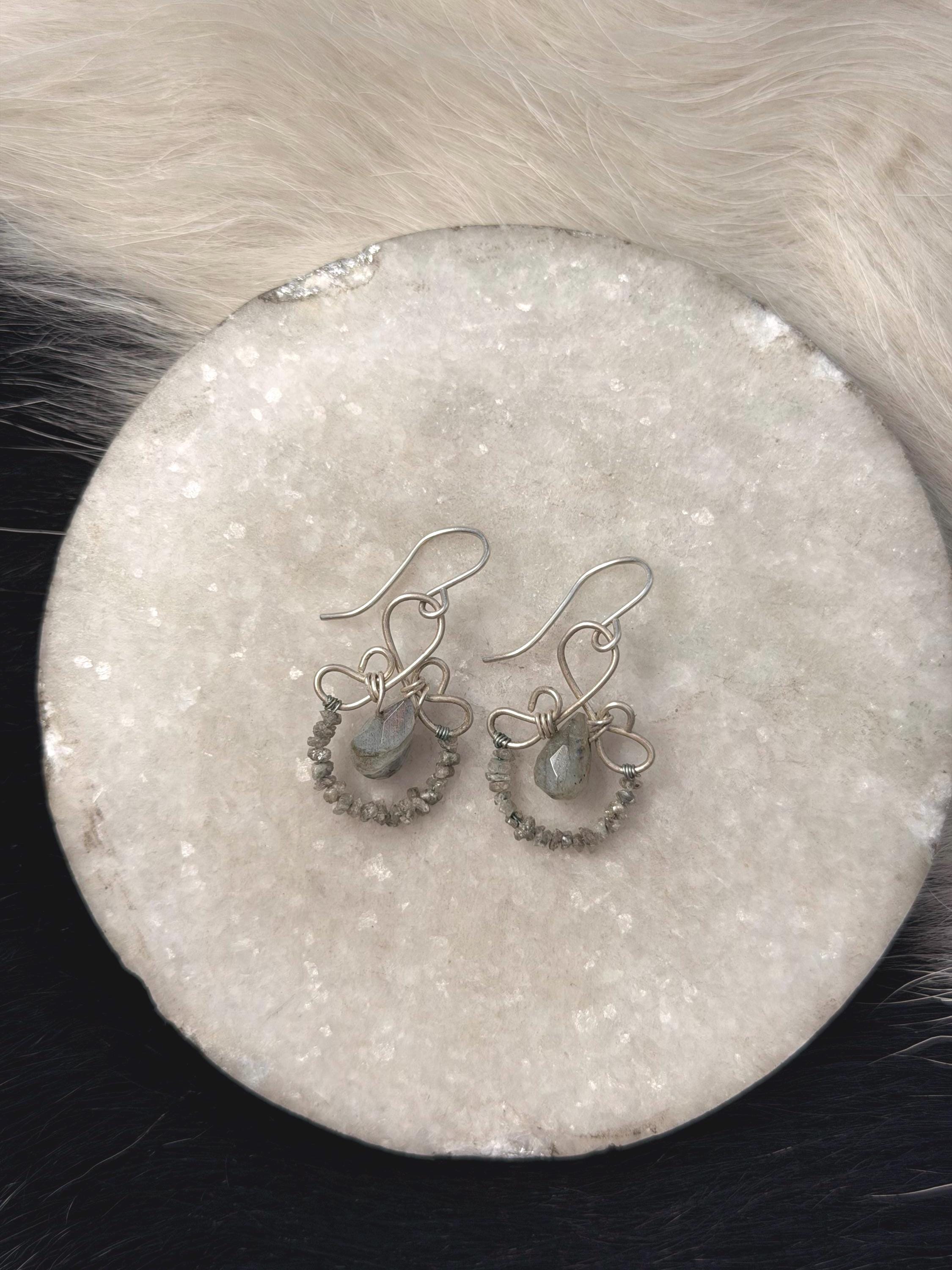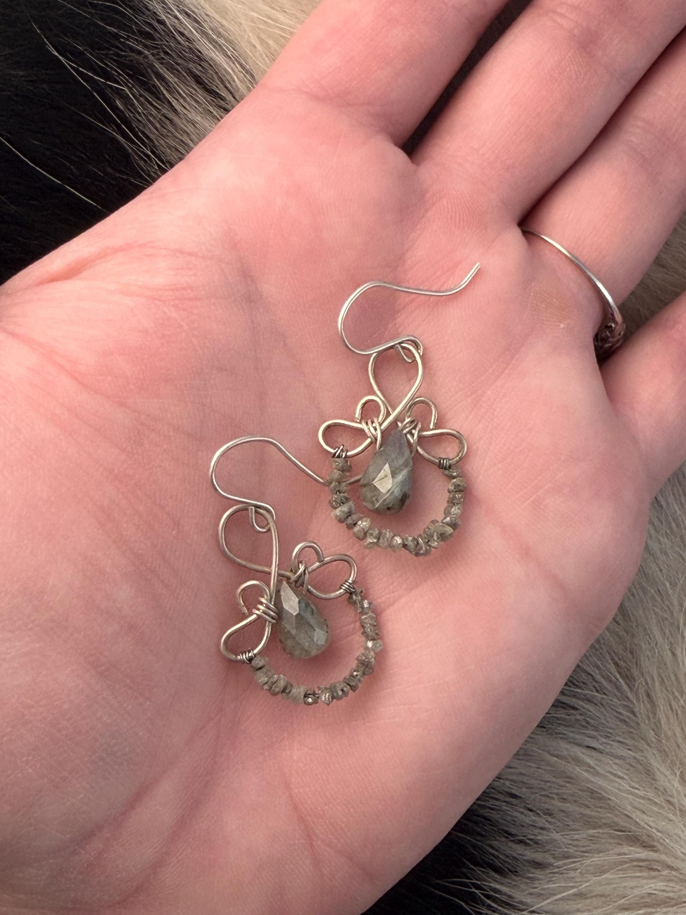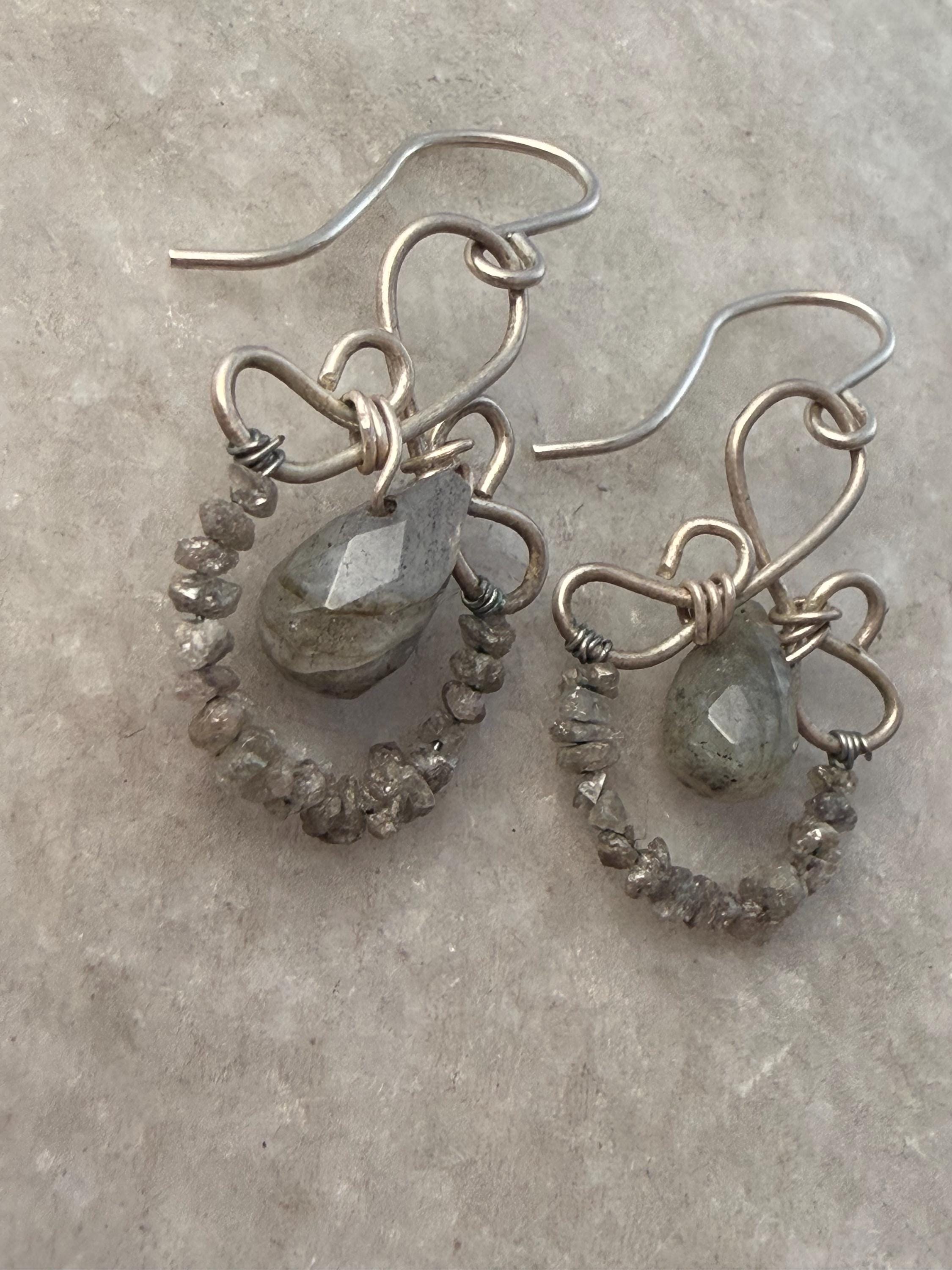 The Emma earring: hand formed sterling silver wire with a labradorite teardrop bead and a string of rough shaped diamond beads